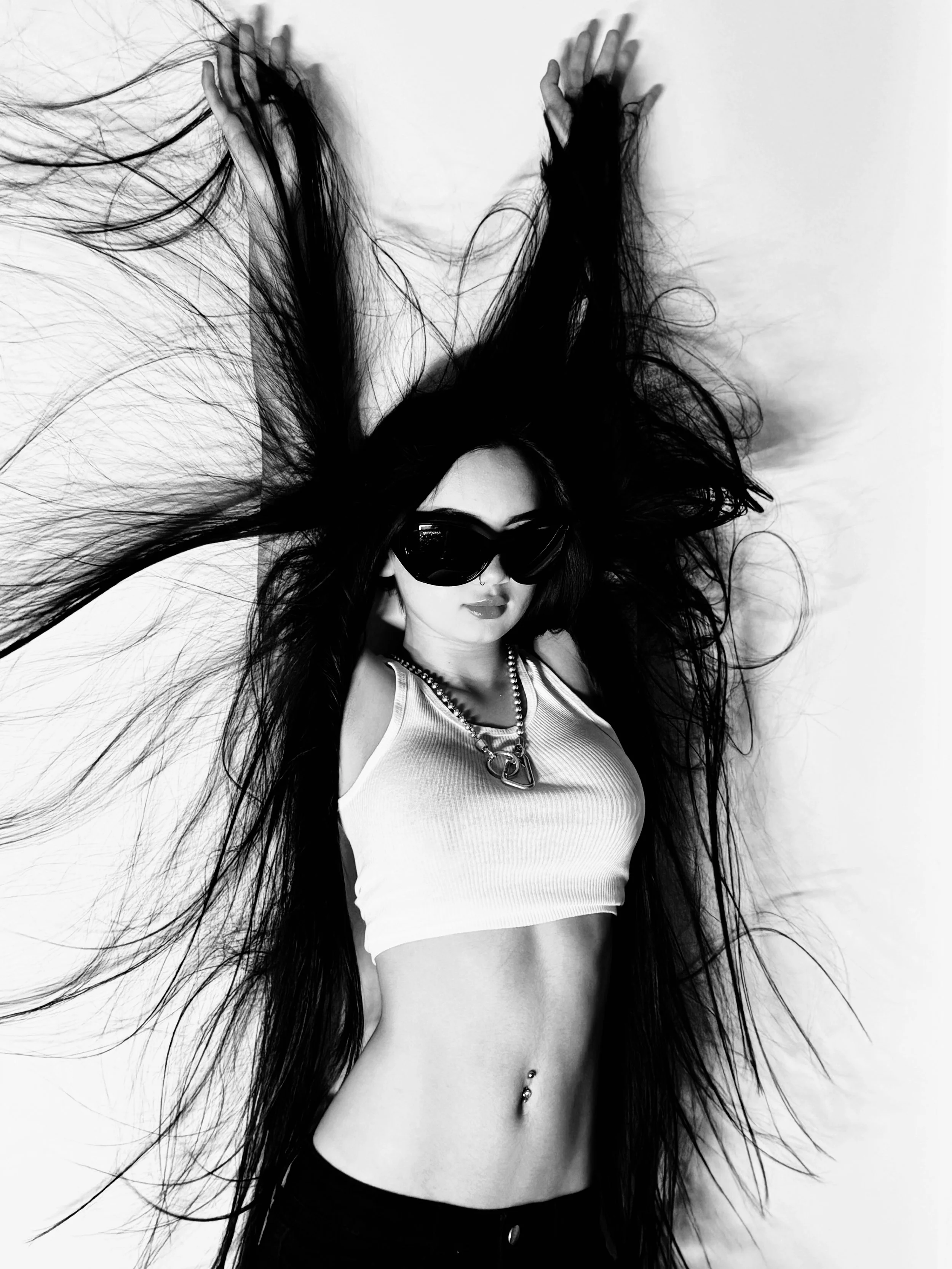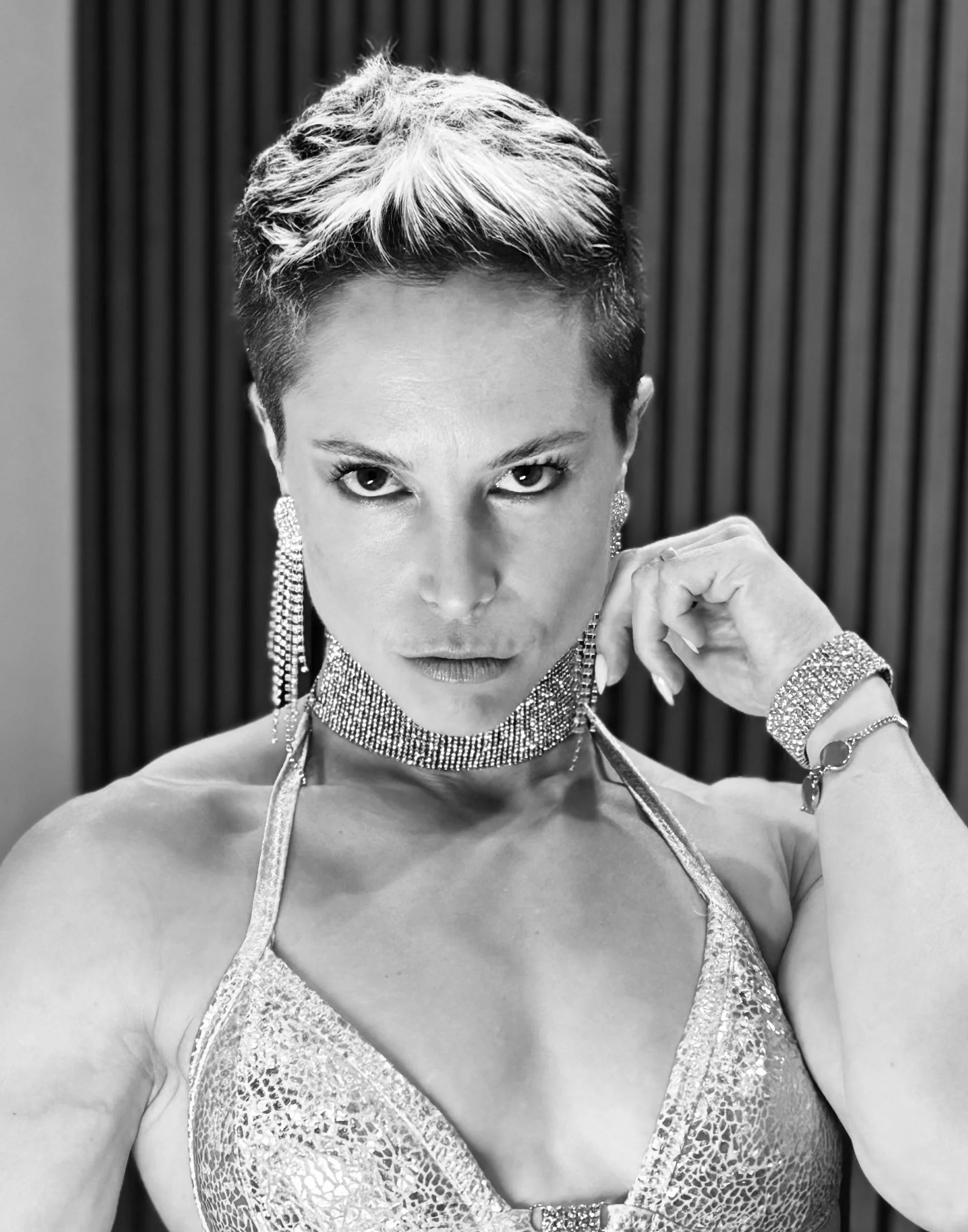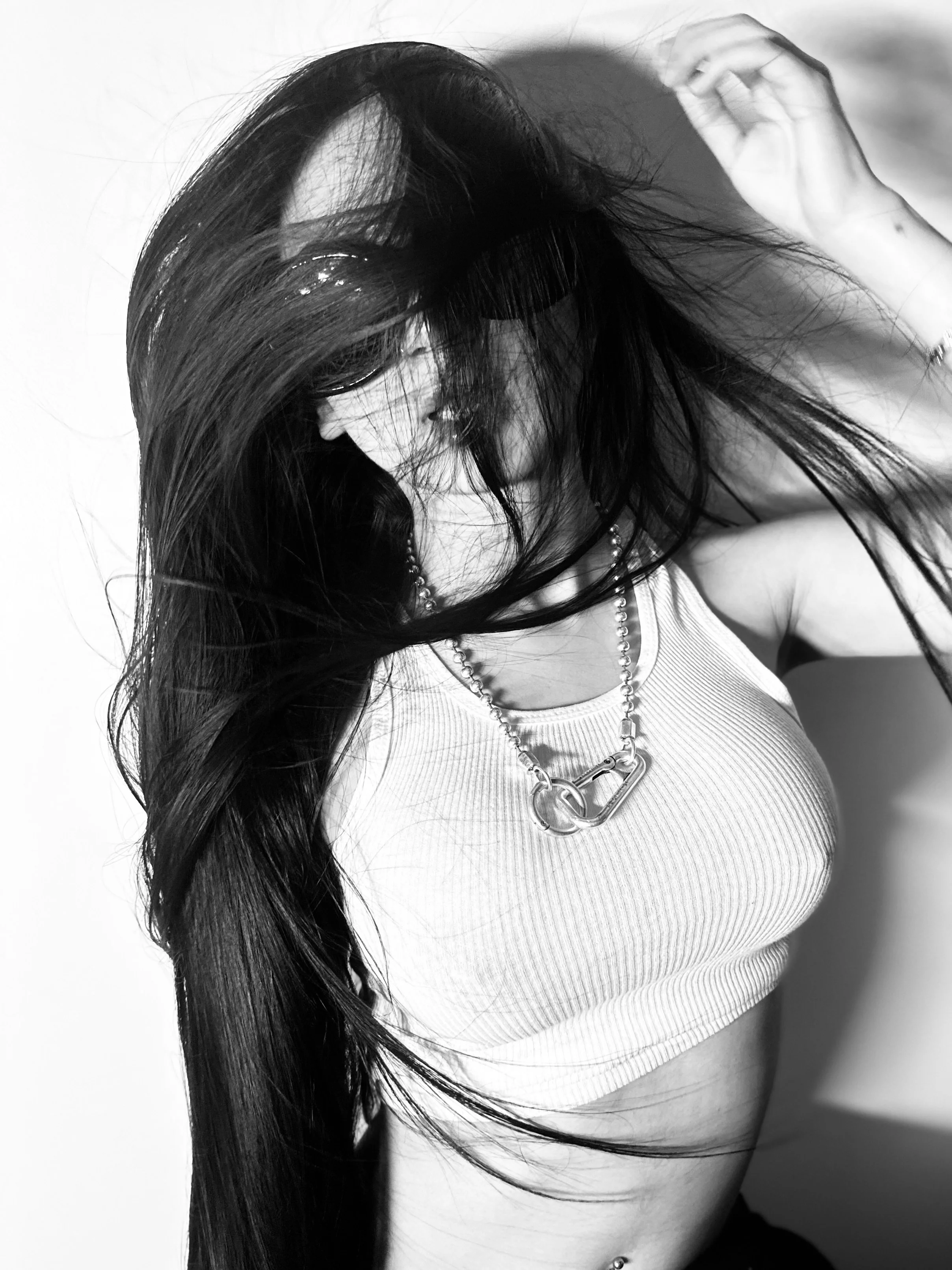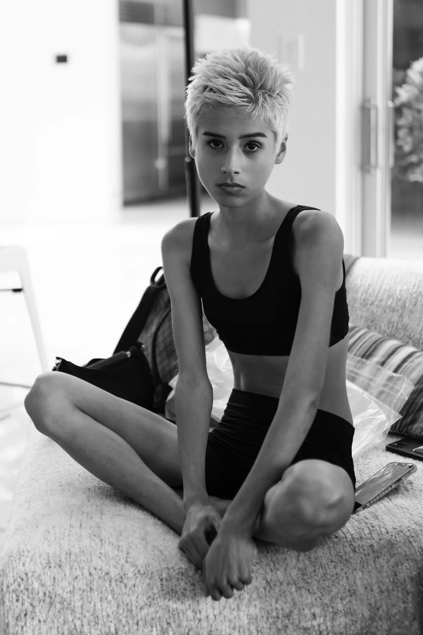 Black and white image of mannequins wearing sporty and casual clothing, including t-shirts, a crop top, and shorts. One mannequin is styled with a wig and sunglasses.