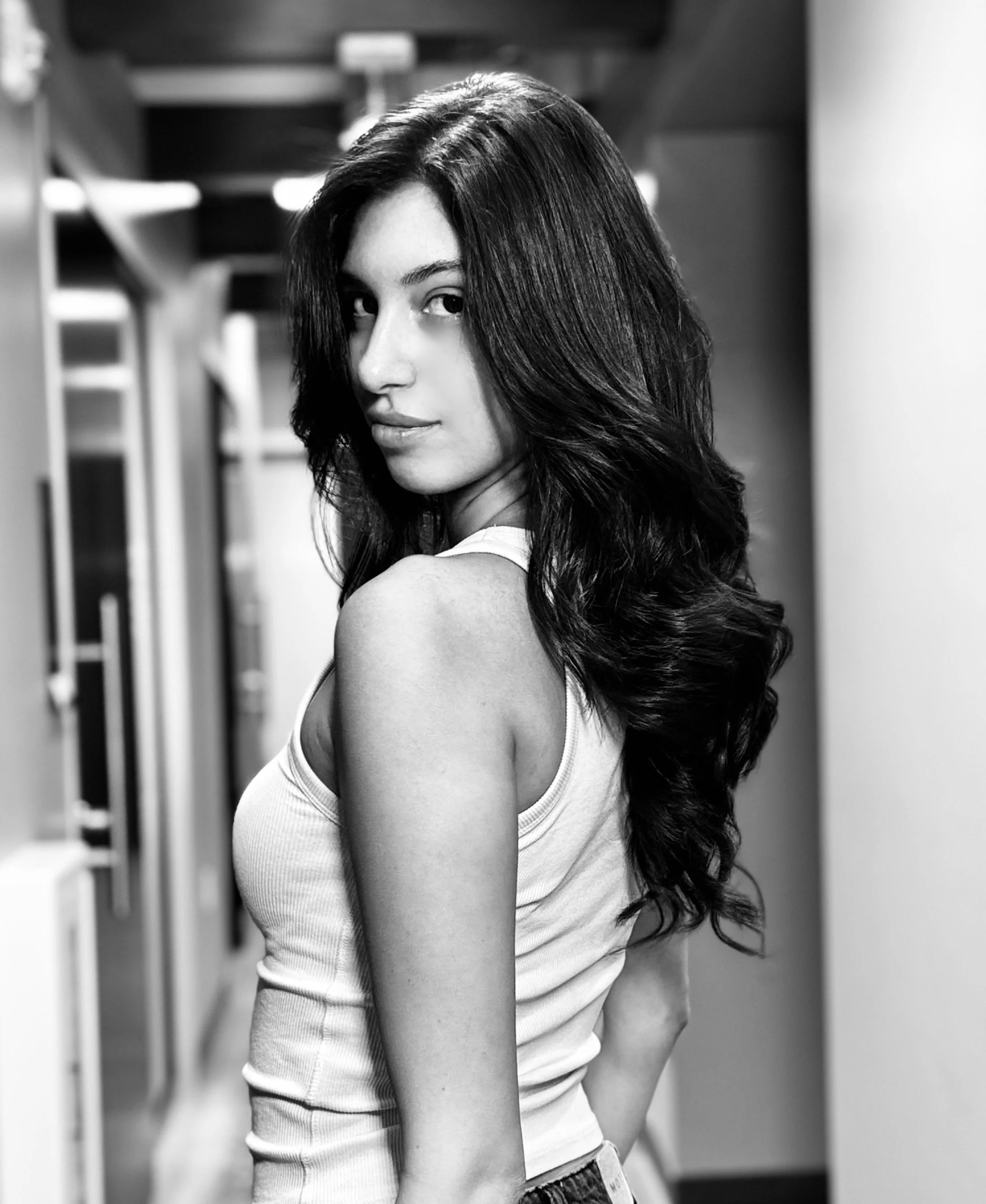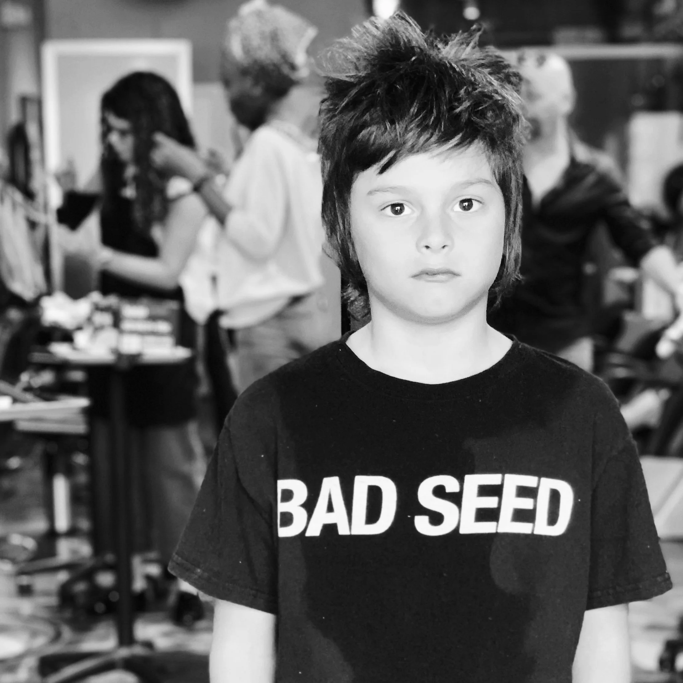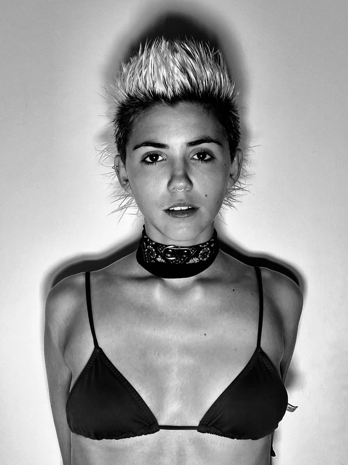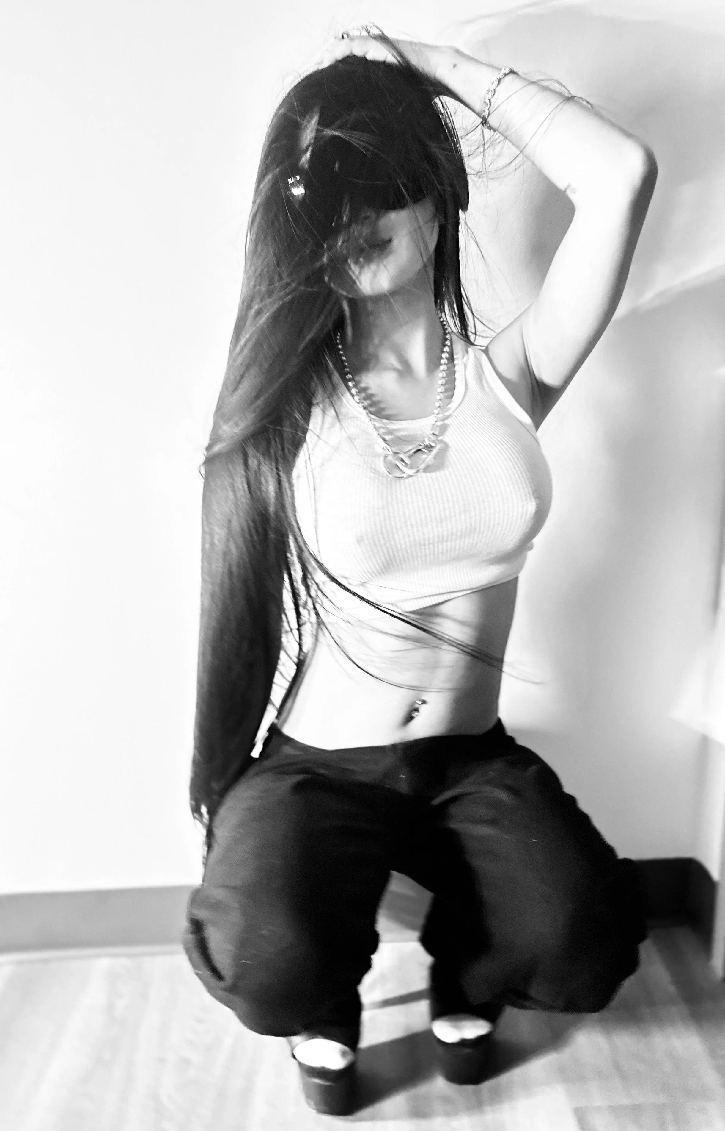 Black and white image of mannequins wearing sporty and casual clothing, including t-shirts, a crop top, and shorts. One mannequin is styled with a wig and sunglasses.