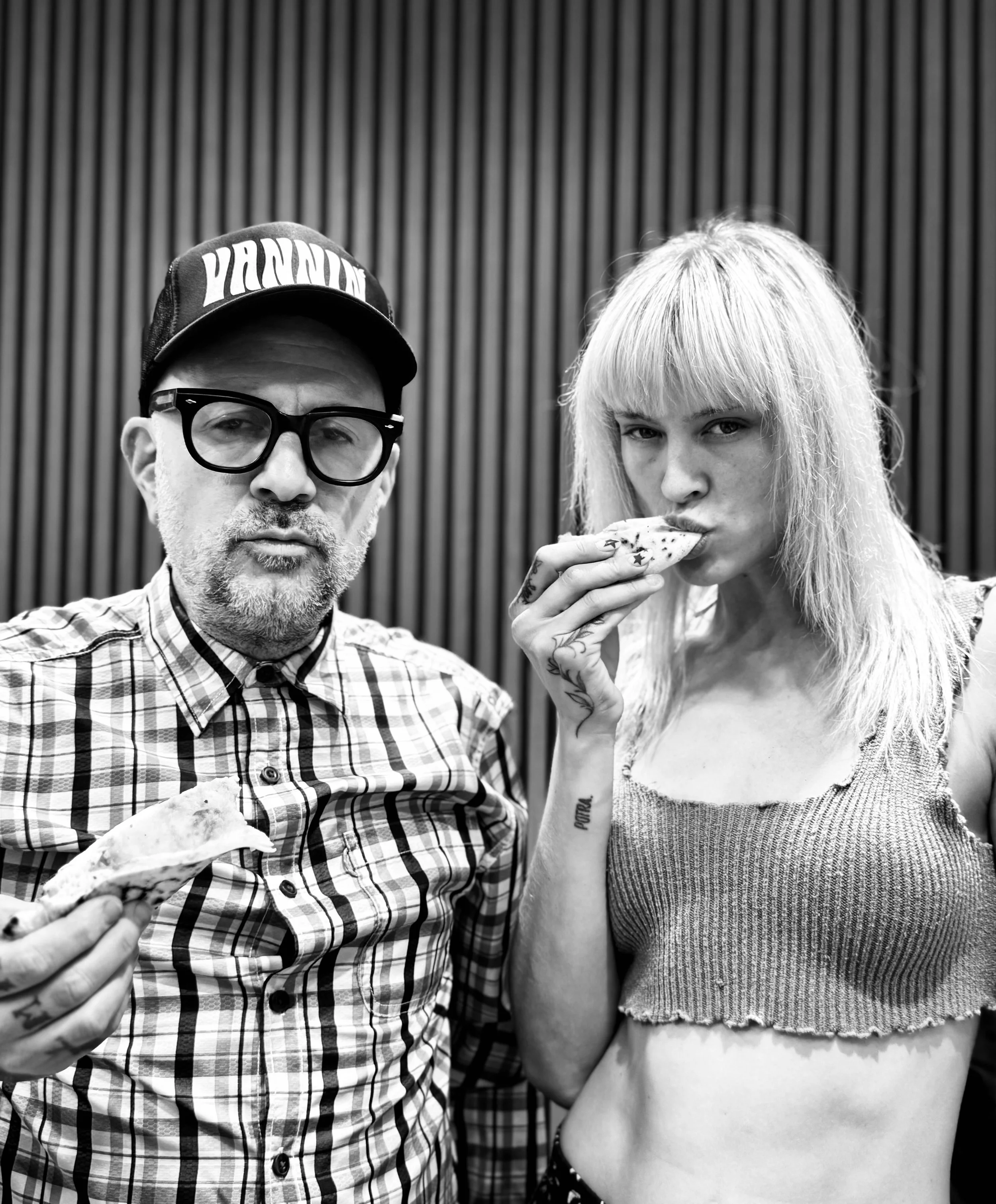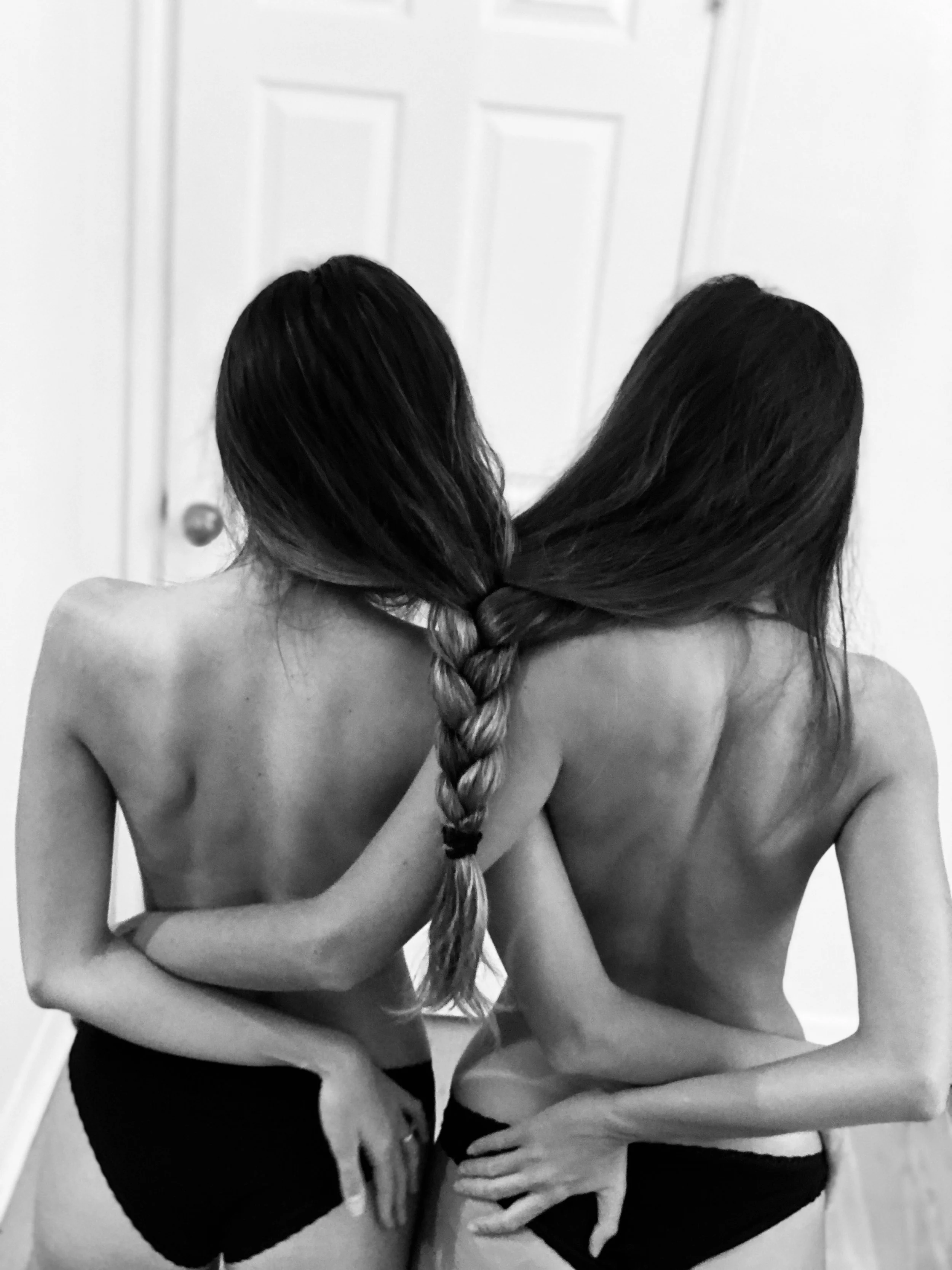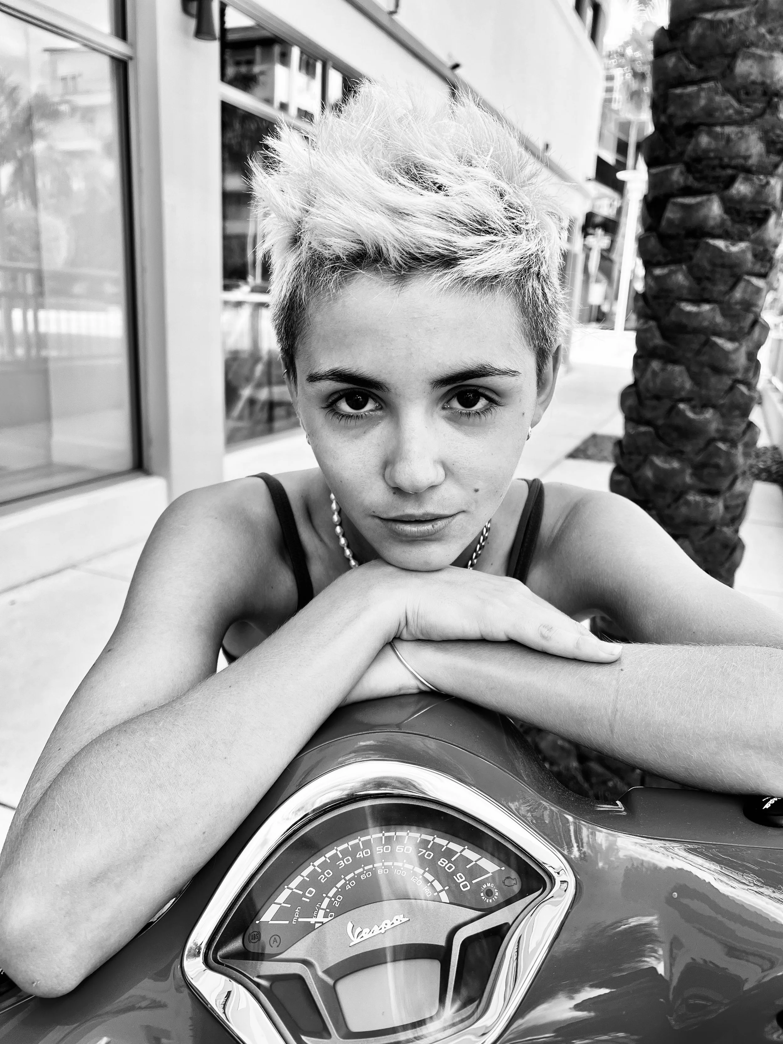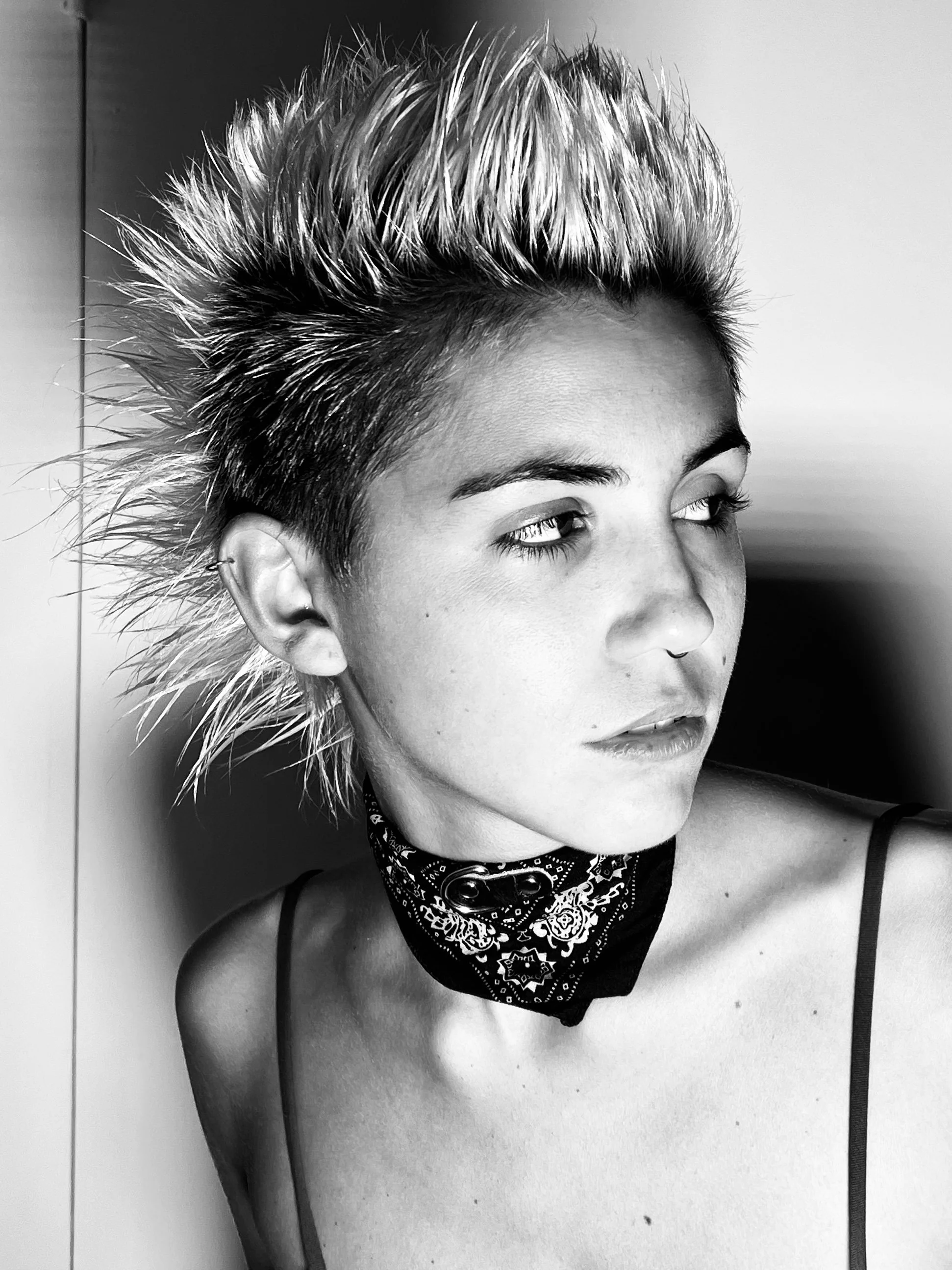 Black and white image of mannequins wearing sporty and casual clothing, including t-shirts, a crop top, and shorts. One mannequin is styled with a wig and sunglasses.