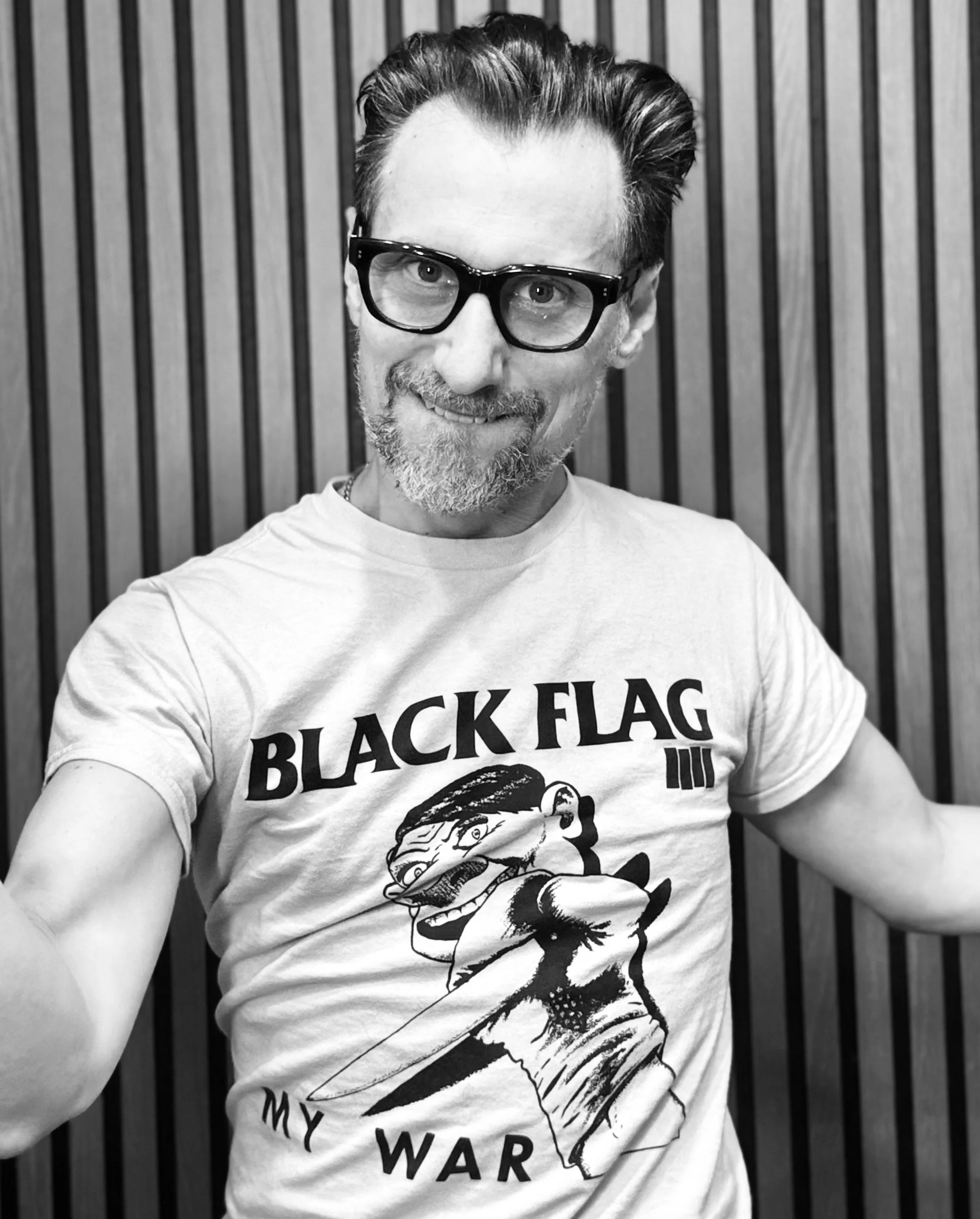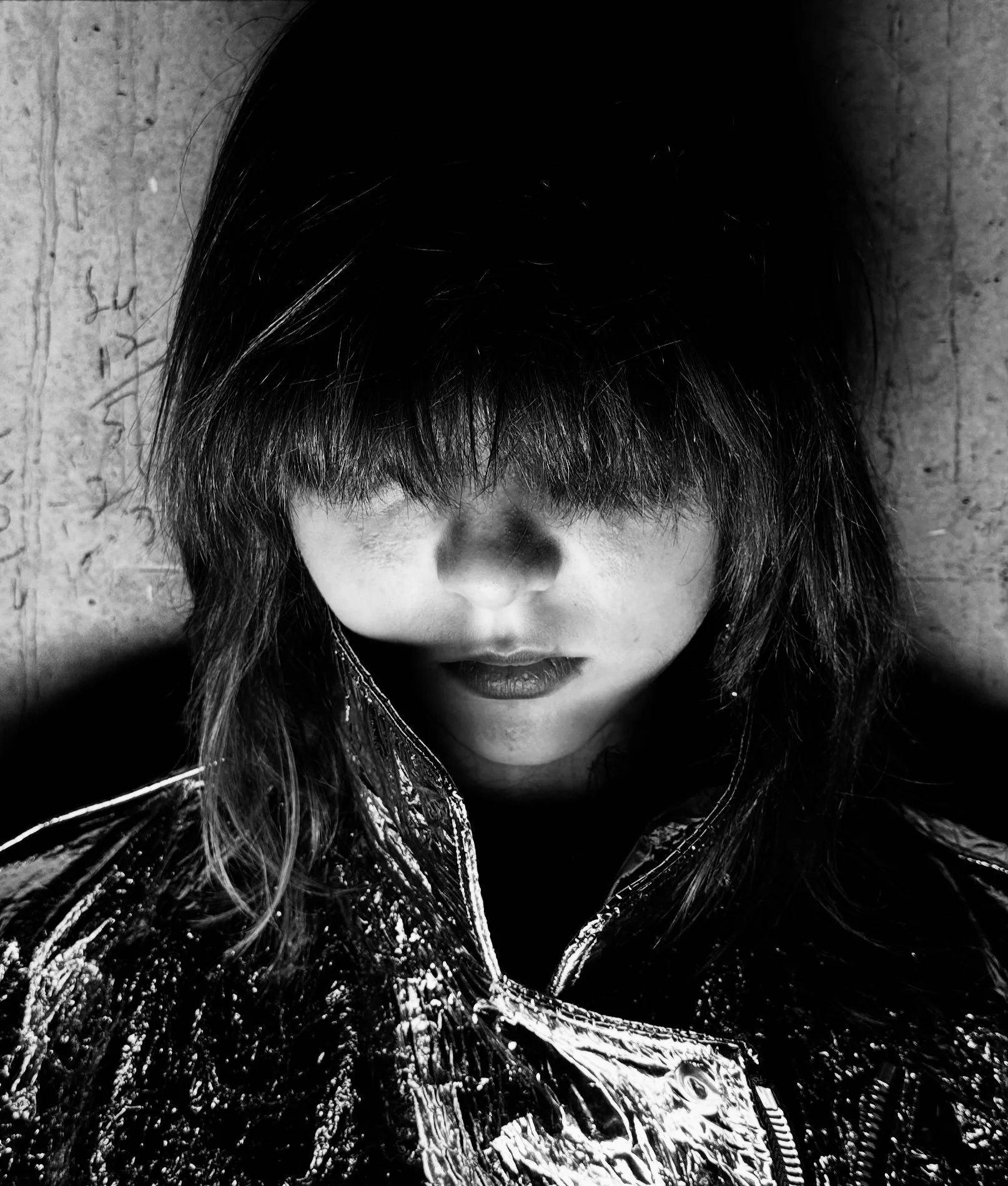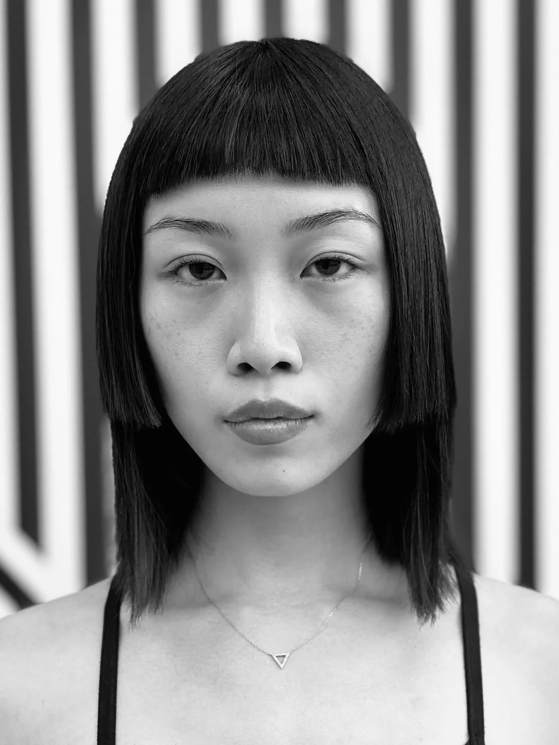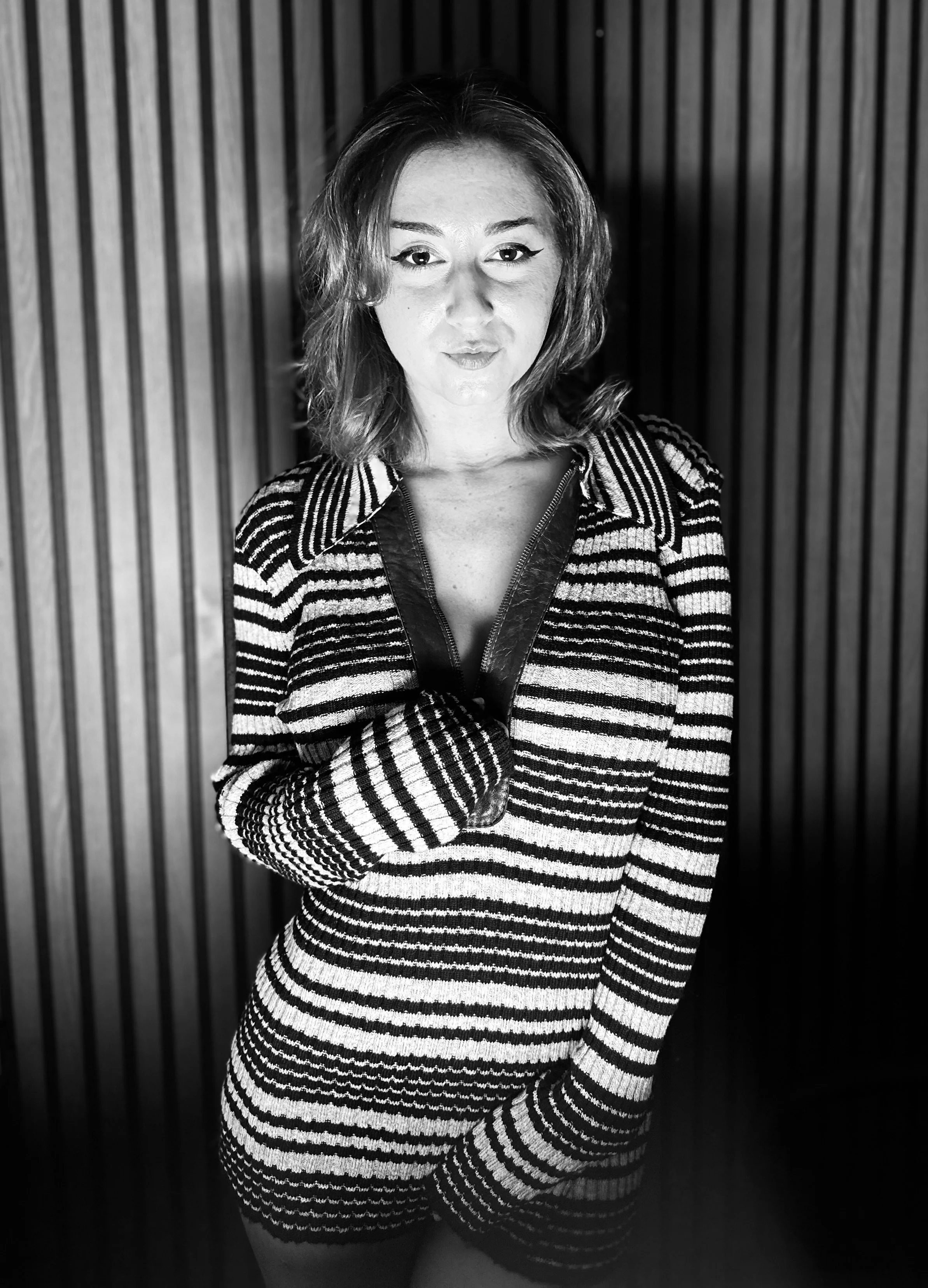 Black and white image of mannequins wearing sporty and casual clothing, including t-shirts, a crop top, and shorts. One mannequin is styled with a wig and sunglasses.
